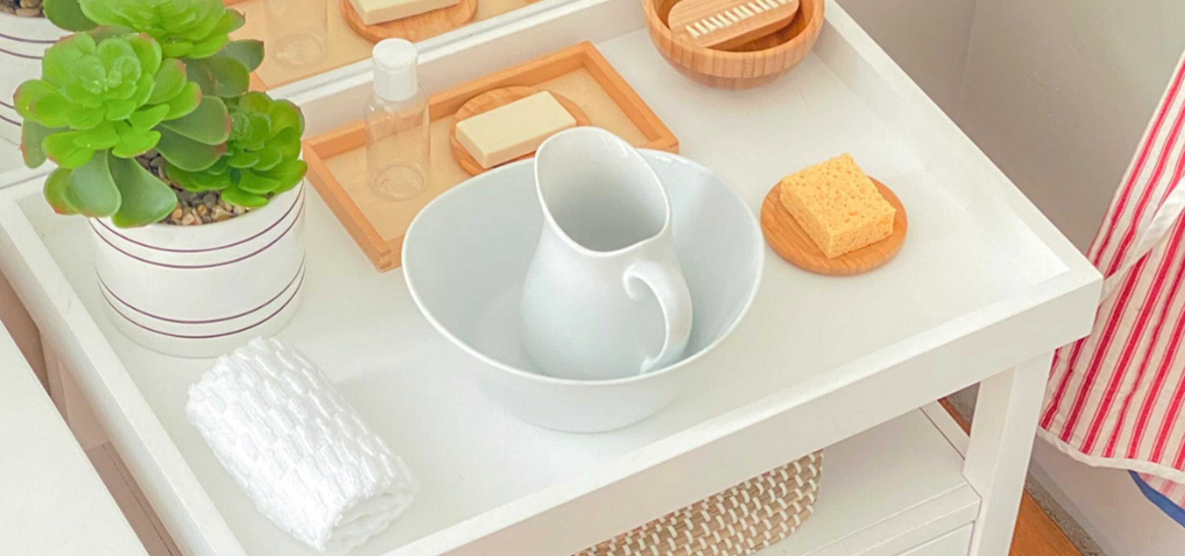 The handwashing activity in Montessori involves the following steps: